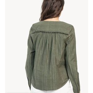 With a touch of Lurex, this Lilla P yarn dyed cross front shirt has a rounded back hem and fringe detailing along the front and back yoke. A gorgeous sage green (officially called Thyme) with thin silver stripes woven through. There is an optional front closure so this top can be worn alone or layer over our new stretch layering camisole. Overdyed for a perfect lived in look
