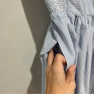 Summery cotton seersucker is shaped into a darling sundress with a sweetheart neckline and smocked sides. Adjustable straps and side pockets. Fully lined with padded cups. 100% cotton.