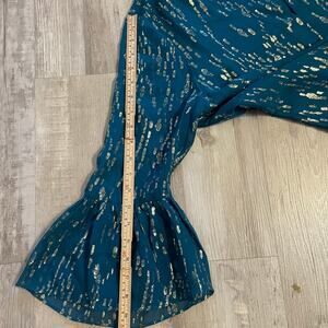 NWT Lilly Pulitzer ELENORA SILK DRESS Inky Tidal Fish Clip Chiffon Teal Size Large. This stunning Lilly Pulitzer Elenora silk dress in teal is perfect for any special occasion. The dress features a V-neckline, 3/4 length ruffle sleeves, and a pullover closure. The chiffon fabric gives the dress a lightweight and airy feel, while the gold chips add a touch of elegance.