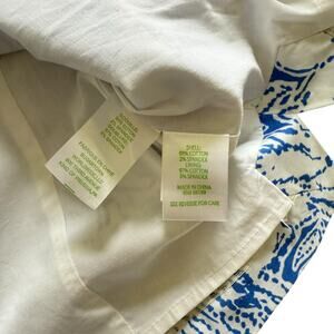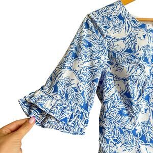 New with tag, Lilly Pulitzer fiesta top in coastal blue. Fully lined. Ruffle detail at sleeves. Keyhold opening on back. Zip and button closure. 98% cotton, 2% spandex.
