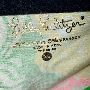The Lilly Pulitzer Juline Hibiscus Size XL 3/4 Sleeve Cotton Stretchy Casual Top is a vibrant and comfortable top perfect for casual occasions. Made from a blend of 95% Pima Cotton and 5% Spandex, this top features a floral pattern in a colorful multicolor design. The 3/4 sleeve and round neckline provide a stylish yet relaxed fit, while the stretchy material ensures ease of movement. With a pullover closure and lightweight feel, this top is a versatile and fashionable addition to any woman's wardrobe.