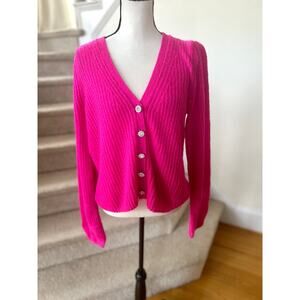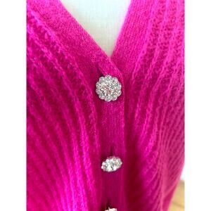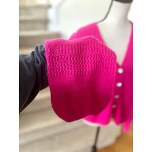 Excellent NWT condition. Hot pink, v-neck, long blouson sleeve cardigan. Knit design on sleeve, rhinestone flower buttons.