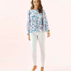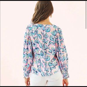 This Lilly blouse is adorable and great combination of pastel colors (just add pearls). The balloon bell sleeves give that feminine touch without getting in the way as the silk fabric comes together to a longer fitted cuff with gold accent buttons.