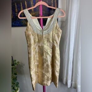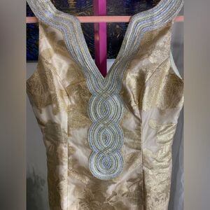 Stunning sleeveless dress in gold and cream. Features intricate detailing on the neckline.