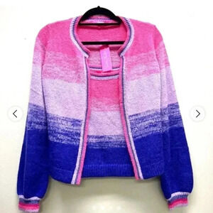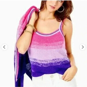 NWT LILLY PULITZER Wool blended Tessalyn Sweater Set Barbie Core. A vibrant colorblocked motif and metallic trim make the Tessalynn Sweater Set cozily chic. The set includes a straight fit tank top and a long-sleeve cardigan with a crew neckline and open front. Barbiecore with Pink Purple. Super soft cozy wool blended. Stretchy.