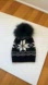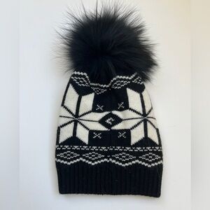 NWT Linda Richards Knit Nordic Black & White Snowflake Hat w/Genuine Fur Pom