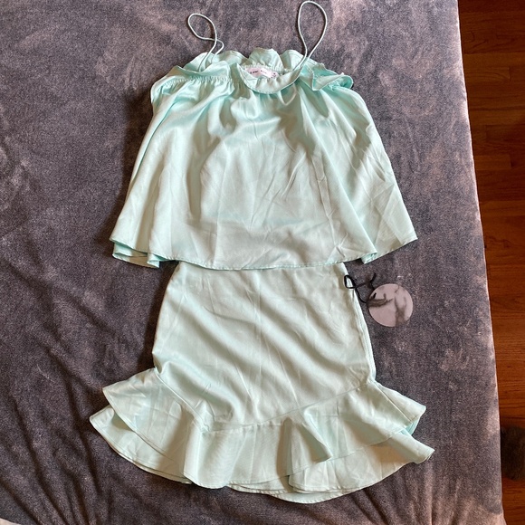 NWT Super cute Line and Dot skirt set! Top has some stretch, skirt does not. Color is a sea green. Summer may be almost over but this should still be a cute addition to anyone’s closet!