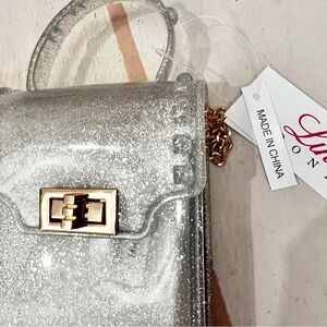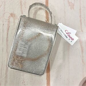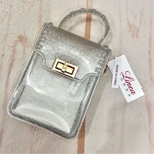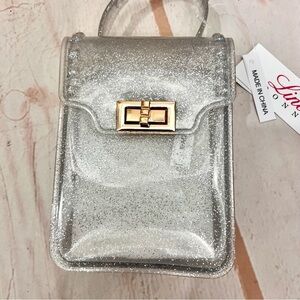 NWT Linea Donna Studded Clear Silver Glitter Sparkle Convertible Jelly Crossbody Kelly Handbag. Perfect for day and night. Gold chain crossbody strap or carry by the handle. Perfect for carrying your cell phone and a few other necessities without bulk.