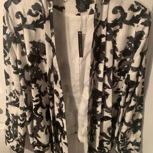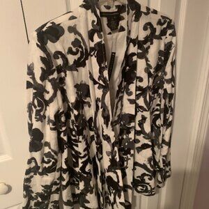 Women's lined linen jacket! New with tags, black, gray and white print. Pleated front and seam across the back, back is shorter than the front.