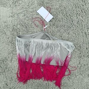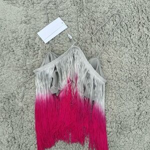 NWT Lisa Maree ‘Sleeping Beauty’ fringe crop top featuring soft pastel-to-pink ombré fringe and delicate spaghetti straps. Perfect for festival season, parties, or a bold night-out look. Size XS.