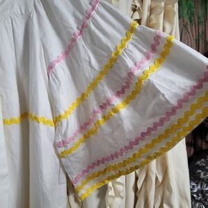 Lisa Marie Fernandez for Target Women's RIC Rac Flare Sleeve Dress. Absolutely stunning dress! Perfect for a Summer vacation or wedding. The Ric Rac Flare Sleeve Dress from Lisa Marie Fernandez. Cheerful style reminiscent of Fernandez’s love for bohemian romance. Billowy flare sleeves, a swirly skirt make up the wonderfully romantic vibes of this dress. Ric rac trim accentuate the voluminous, tiered design of the sleeves and skirt. A tie belt adds shape to the silhouette. Side pockets complete the piece. Lisa Marie Fernandez brings her signature bohemian-chic style to Target. 55% Linen, 45% Rayon, Midi, Machine Wash & Line Dry.