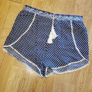 Navy with cream ditzy floral, cream trim, and Paisley print elastic waist with drawstring. Draw string has tassels. New with tags. Fully lined. 14.5 in across the waist. 12.5-in rides. 2.5-in inseam.