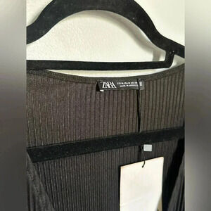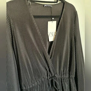 Sized at Medium, this Zara little black dress that has never been worn and offers a low-cut V, ballooned sleeves and semi-pleated fabric. A cute dress for a night out, or a celebration.