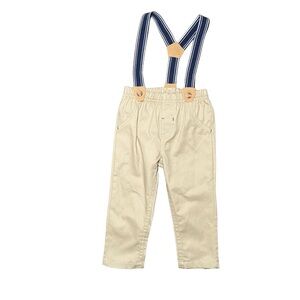Three piece set that includes the button down shirt the suspenders and khaki pants
