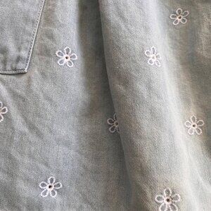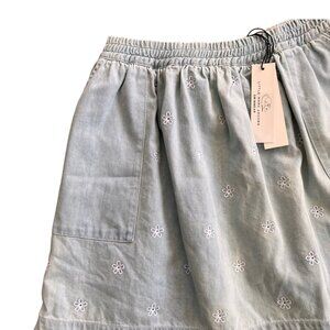 • light wash denim skirt; elastic waist; daisy print and eyelet cutouts all over