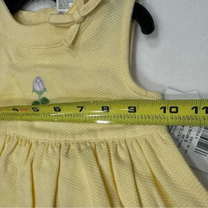 BRAND NEW with tags. Adorable Girls yellow cotton dress with matching bottoms. Sleeveless, embroidered purple flowers and button up back. Size 9 months. See photos for measurements
