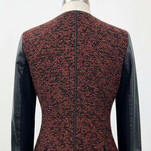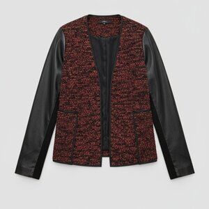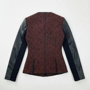 Add a statement piece to your collection with this NWT Live a Little Tweed Wool Cardigan Jacket. Designed with a striking mix of textures, it features a classic red tweed body contrasted by bold faux leather sleeves for an elevated, edgy look. Perfect for layering, this jacket brings both warmth and style in a versatile XL size.