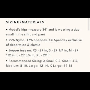 • Jogger inseam: XS - 27 in, S - 27 1/4 in, M - 27 1/2 in, L - 27 3/4 in, XL - 29 in