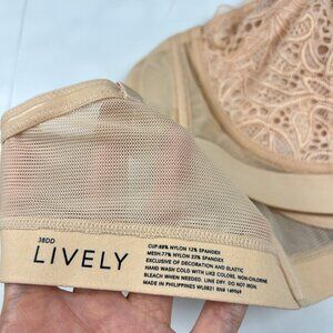 NWT Lively Toasted Almond Flexible Underwire Lace Strapless Bra. Beige, cream, nude. Lace cups with soft mesh lining. Wider band for support. Soft boning at sides for extra support, no rolling or slipping. Adjustable removable straps. Hook eye closure. Nylon spandex blend. Size 38DD. Retail: $48. (349)