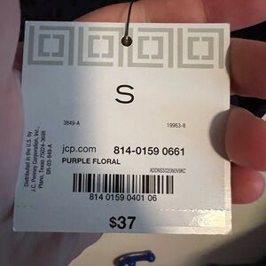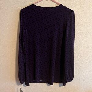 NWT Liz Claiborne purple blouse with small cut outs around the neck and black leaf pattern. Size small. Color is true to first picture.