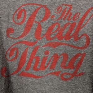 NWT Local Celebrity Grey The Real Thing Scoop Neck Tee. Heather grey tee with red text "The Real Thing." Scoop neckline. Relaxed fit body with fitted short sleeves. 50% Polyester, 38% Cotton, 12% Rayon. Made in the USA.