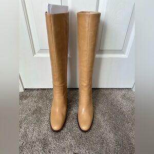 Tall shaft boot with chunky block heel in khaki-colored vachetta leather. Features a padded footbed with gold stamped logo and an almond toe. Pulls on. 3.5-inch heel.