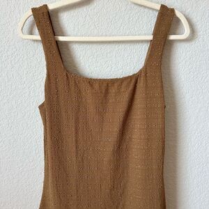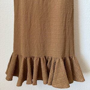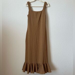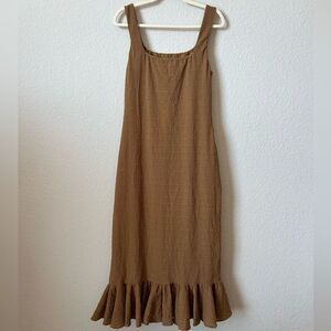 Sleeveless mid-length dress in beautiful brown puckered fabric. Features a square neckline and a ruffled hem. Yessica's stretchy fabric imparts a fitted yet comfortable shape. Unlined.