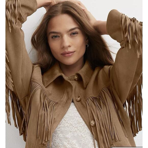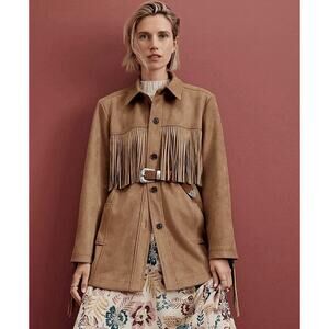 New with tags LOFT faux suede fringe jacket in a rich camel/tan tone that instantly elevates any outfit. Soft faux suede with dramatic fringe detailing across the chest, sleeves, and back creates effortless movement and a statement look without feeling costume-y. Designed with a button-front closure and a flattering structured silhouette, this jacket layers beautifully over denim, dresses, or a simple tee. Perfect for modern boho, western-inspired styling, festival season, or everyday cool-girl wear. Brand new, never worn — a standout piece you won’t find twice.