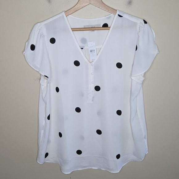 NWT Loft Off-White & Black Polka Dot Tulip Short Sleeve V-neck Blouse Size Large