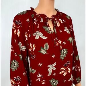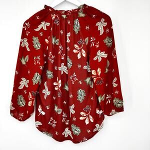Bring a touch of autumn romance to your wardrobe with this LOFT botanical print peasant blouse. Crafted in a rich rust hue, it features a detailed botanical floral pattern in shades of green, ivory, and orange. The split neckline with adjustable ties offers versatile styling — wear it open for a relaxed, boho look or tied for a polished finish. Billowy 3/4 length sleeves with elastic cuffs, a relaxed fit, and lightweight woven fabric make this top perfect for layering or wearing on its own throughout the season. Pair it with jeans, skirts, or layered under a cardigan for an effortless autumn outfit.