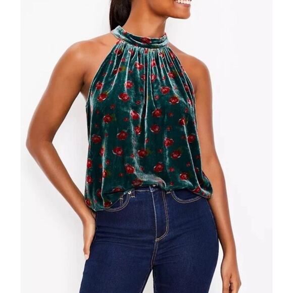 NWT Loft Shirred Floral Velvet Sleeveless Halter Top Size XL Green Flowy