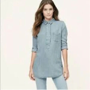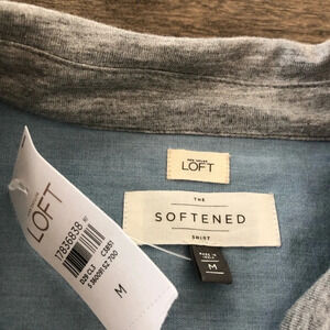 NWT Loft Size Medium Softened Blue Chambray Popover Shirt Long Sleeved Gray Knit