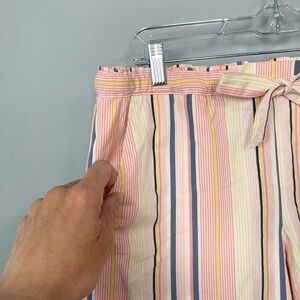NWT Loft Striped Elastic Waist Drawstring Tie Waist Shorts with Pockets Size S. Loft Pink yellow and blue vertical stripe tie elastic waist with self tie drawstring shorts. Pull on style. Pockets at hips. NWT. Orig 49.50. 100% cotton. Machine wash, tumble dry. 471981. 70280. In excellent, new with tags condition. Measurements taken flat: waist unstretched: 17", stretched: 19", inseam: 3.5", rise: 9.5".
