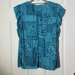 This pretty top has a woven front and a soft knit back. It has flutter cap sleeves with a round neck with a back button keyhole. Top is a little roomy and hits at the hip. Fabric content is front body 100% polyester and back body 100% rayon, machine washable. Measurements are length 26 inches and pit to pit approximately 23 inches.
