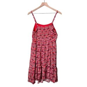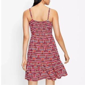 Loft women’s ikat smocked back dress in a red, green, pink and white stripe pattern. Size 8.