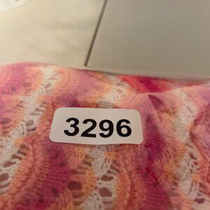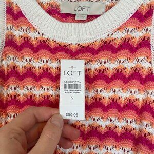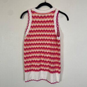 This is an open scalloped knit striped pink orange and white sweater vest from Loft. Sleeveless sweater. 70s style, scalloped edge summer sweater