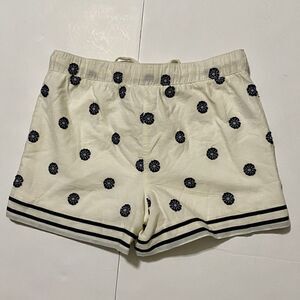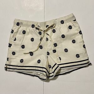 Super cute 100% cotton off-white shorts with navy blue trim. Fully lined, pull on with slash pockets and drawstring closure. They have the original attached tags, 1 inch side slit and an elastic waist. Attached also is the tags it must be removed prior to wearing or washing. Machine wash cold, tumble dry low with cool iron if needed. Approximate measurements lying flat are waist: 15” rise: 9 1/2” inseam: 4”