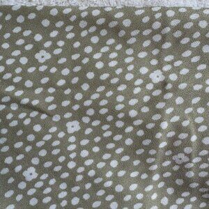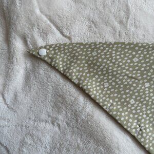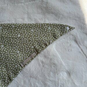 This cute dog bandana features a taupe and white floral and polka dot pattern. It is the perfect accessory for your pet, and it has a button closure. It is a size medium.