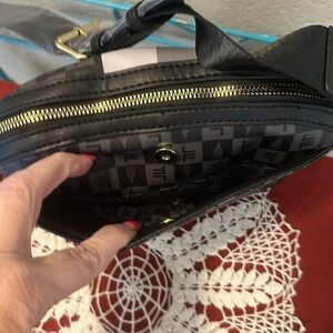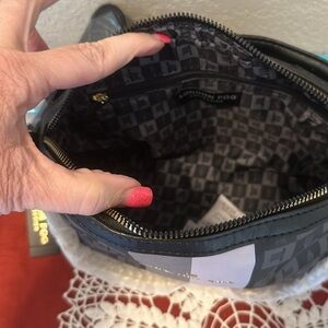 NWT London Fog handbag. Crossbody or shoulder. I didn’t take the packaging off of the gold or the buckle to make sure it doesn’t get scratched on transit. Length 9.5”. Height without strap 6.5”. Width 4”. Measurements are approximate. Pocket on back and inside. Strap is adjustable. Color black, gray, and white. Strap is black.