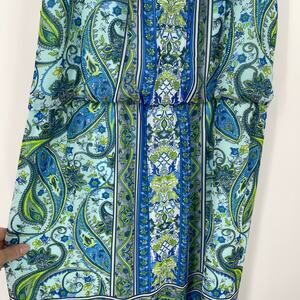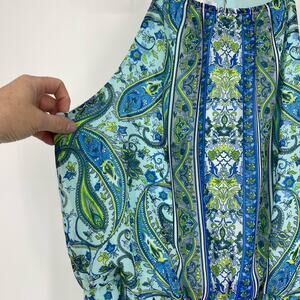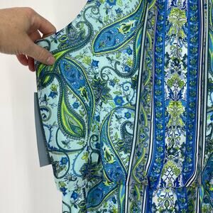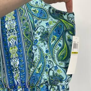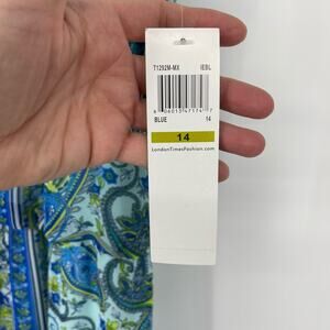 NWT London Times Sleeveless Blue Floral Paisley Dress in Size 14. This is so pretty and perfect for the warm season. Add a cute lightweight sweater and you could wear this into the fall too. See all pics and measurements below.