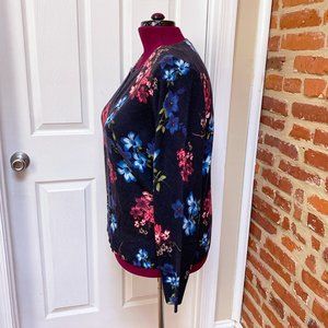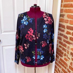 NWT Lord & Taylor cardigan, size 3x. Black background with red, blue, & green floral printed super-soft two-ply cashmere. Matching buttons. Round neck. Ribbed cuffs & hem. 100% cashmere.