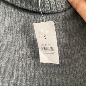 This is a brand new Lou & Grey women's sweater in size medium. It is a solid gray pullover sweater with a turtleneck and long sleeves. The sweater is made of a blend of nylon and acrylic materials and is machine washable.