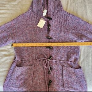 This knitwear is plus size. Coquette, fairy, prarie, or cottagecore style. The sweater features purple and blue wool fibers, a v-neck neckline, hood, large horn / tooth imitation toggle buttons, a waist string to cinch and tighten, deep 7.5 in pockets, 2.9 feet in length, and is BRAND NEW WITH TAGS.