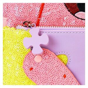 This exclusive Loungefly Patrick Star mini backpack shines with colorful sequins. Patrick’s applique face rises up over the top of the front pocket, which carries splashes of color and flowers characteristic of his shorts. His arms stick out on the sides, and you can move them, so that he waves at all the passersby. A silicone charm of a flower tops off the look. Pack just what you need for the day for some swimmingly fun adventures.