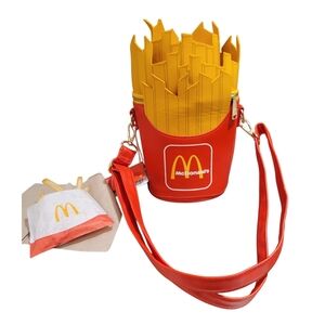 Unique bag shaped like a box of fries. Features McDonald's logo. Bold red and yellow colors. Perfect for fast food lovers.