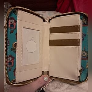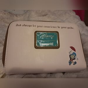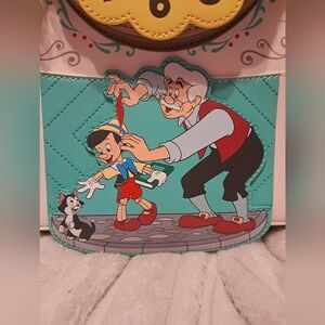 This NWT's Loungefly WonderCon 2023 Disney Pinocchio Cuckoo Clock Figural Mini Backpack and wallet, shaped entirely like a cuckoo clock, features Geppetto and Pinocchio, standing on a stone-paved step, just in front of the house front doors. Pinocchio is reaching for Figaro, and Geppetto is tucking a feather into Pinocchio's hat. Above them, a delightful clock appears, and the hands on the clock are movable! The circular clock face is actually an extra front pocket from which an enamel zipper charm of Jiminy Cricket floats down with an umbrella. The interior lining of the pocket shows a print of a robin with baby birds in a nest. Two tassels and a vegan leather charm of an apple dangle from the clock. Embroidered and debossed details make up the architectural features of the cuckoo clock house. On the side panels, you'll find goldfish and wooden toys in the windows, framed by charming shutters. On the back, the embroidered and debossed details continue, and you'll find the words, "And always let your conscience be your guide." This is a 2,200-piece limited edition Loungefly exclusive.