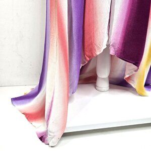 Beautiful rainbow vertical striped. Drawstring waist widens quite a bit. Short batwing sleeves, high/low hemline, rope tie waist closure.