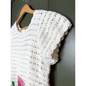Enchanting crochet top in creamy ivory, detailed with vibrant floral appliqué embroidery at the waist. Features a classic crewneck, short sleeves, scalloped edges, and a covered back-button placket for easy style and subtle flair. Fully lined with separate tank that's included.