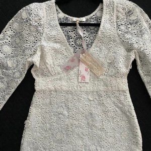 Forever begins in our Faye Dress, a short and sweet piece for your big day. This extra special minidress features a custom lace overlay, picot trims and flower appliqués to create dimension. A deep v-neck is framed by sheer puffed 3/4-length sleeves. Below a fixed waist, the skirt has a trim a-line. Shown here in True White. Gorgeous "something blue" bow embroidered in the dress! Bust: 35.75" Waist: 30.25" Hip: 34.75" Length: 31.25" This is perfect for stagecoach, coachella, festival, dream wedding, Beach wedding, Bridal shower, Rehearsal Dinner, Engagement Photography, Wedding photo shoot, Reception wedding party Valentine’s Day Spring Summer Vacation Resort Office Work Revolve Shopbop Nordstrom Saks Eileen Fisher JCrew H&M 90s Y2K Eileen Fisher Ralph Lauren Farm Rio Lululemon veronica beard Faithful Brand Anthropologie Reformation Doen Jens Pirate Booty For Love and Lemons Chloe Zimmermann Kendra Scott Agua Bendita Great Simkhai Alice Olivia ALC Prada Chanel Louis Vuitton Fendi Gucci Balenciaga Hermes Christian Dior Saint Laurent Fendi Christian Louboutin Valentino Marc Jacobs Alexander Wang STAUD Zara Mango Roller Rabbit Easter Date Night Black Tie Cottagecore Free People Revolve ASOS Everlane Perfect for a night out or sorority event