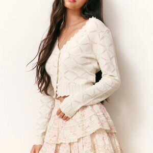 Cozy chic in the Petra Cardigan. Featuring a rib pointelle fabric, this knit is reimagined with our sweetheart argyle pattern with a pointelle detail, a v-neckline, our custom LoveShackFancy faux shell heart-shaped buttons, and pointelle scallop trims at the hem and the cuffs.
